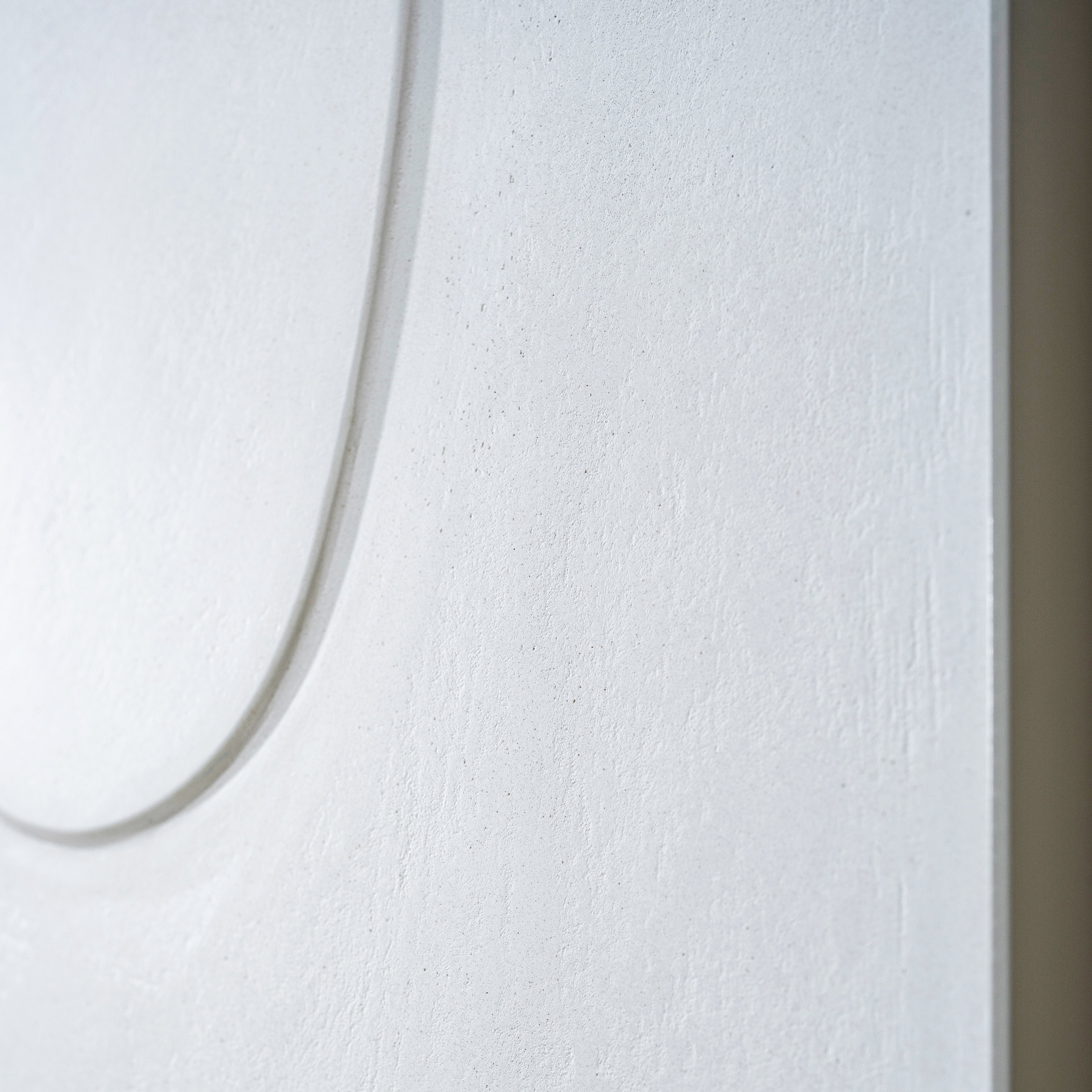 Material: Carved wood panel recovered with white limestone.