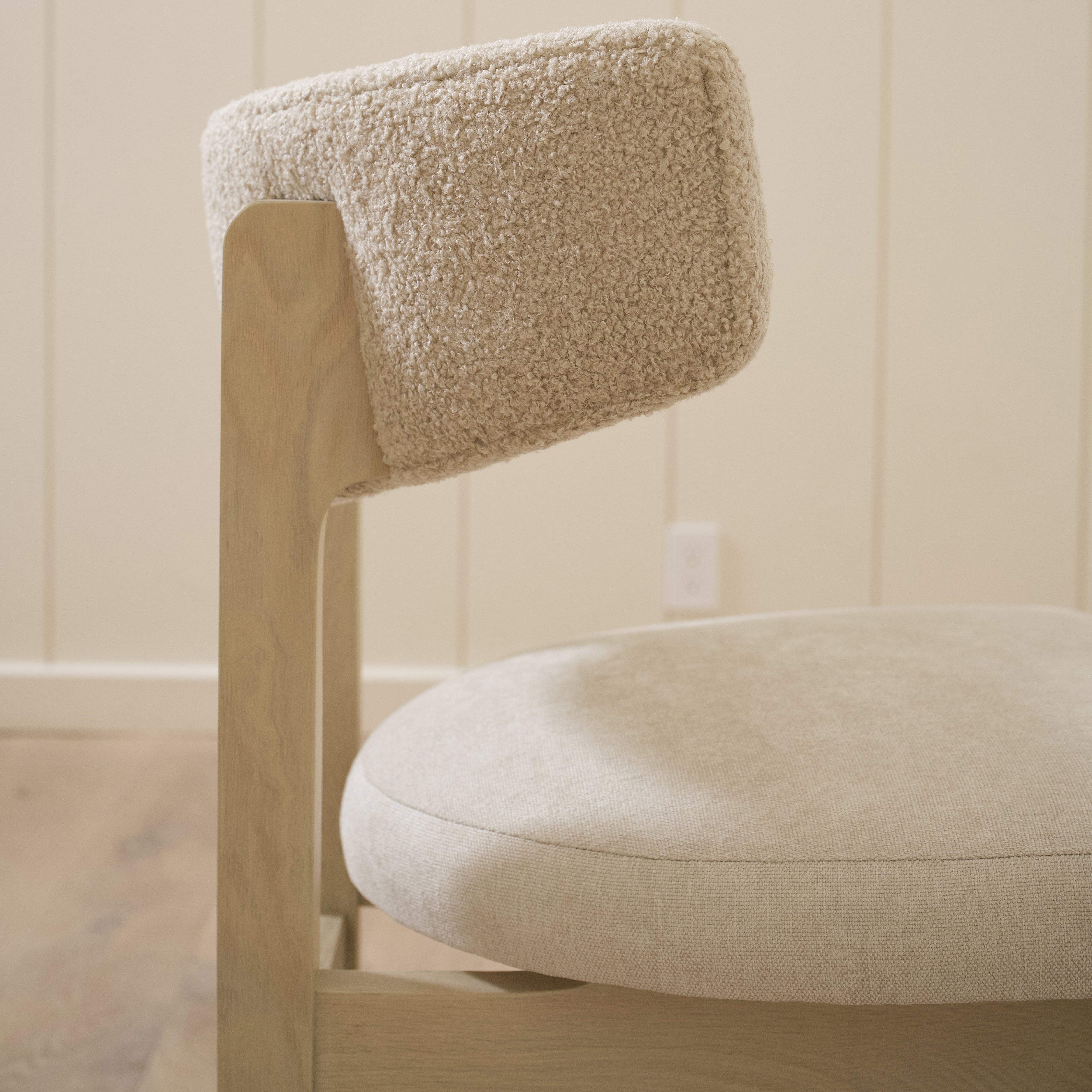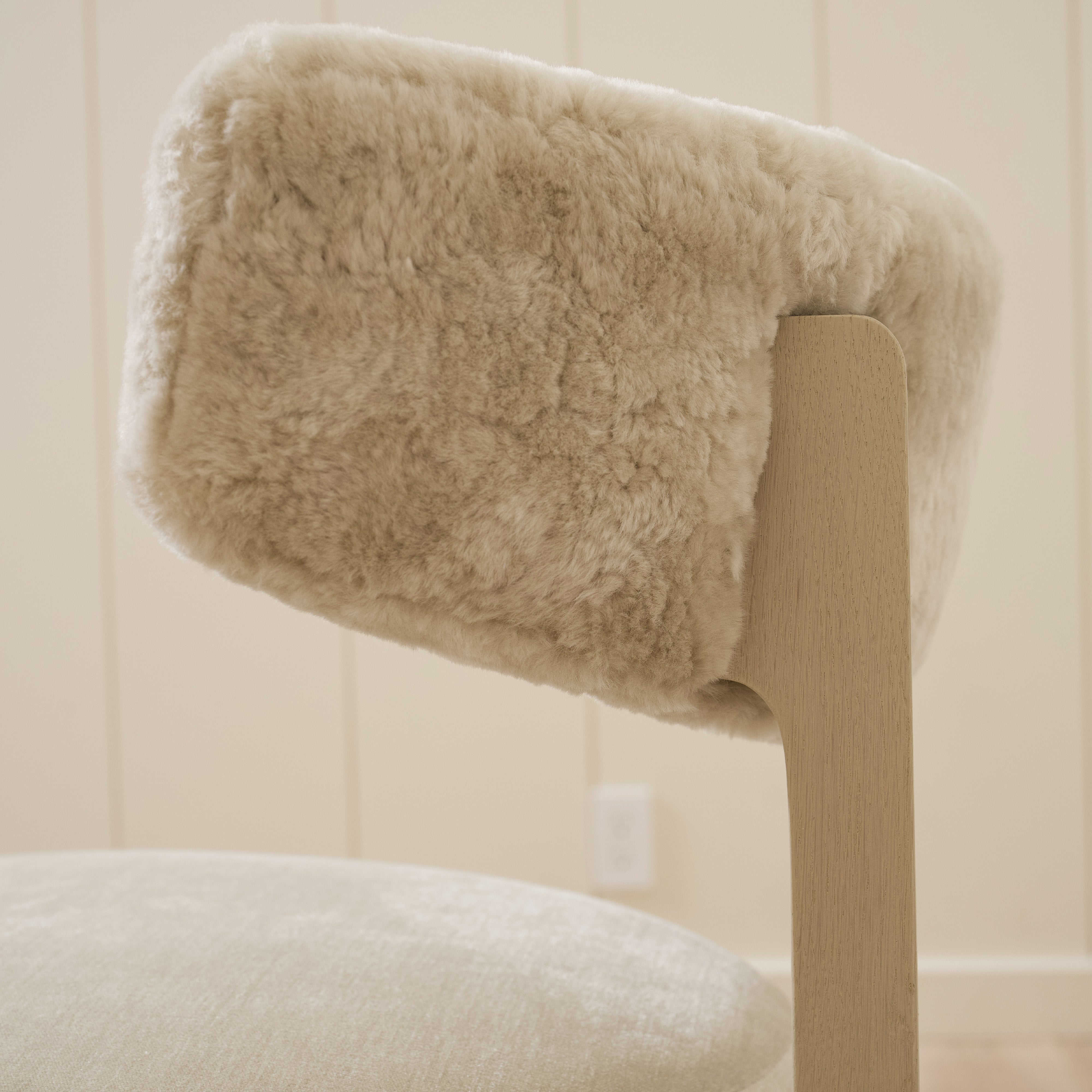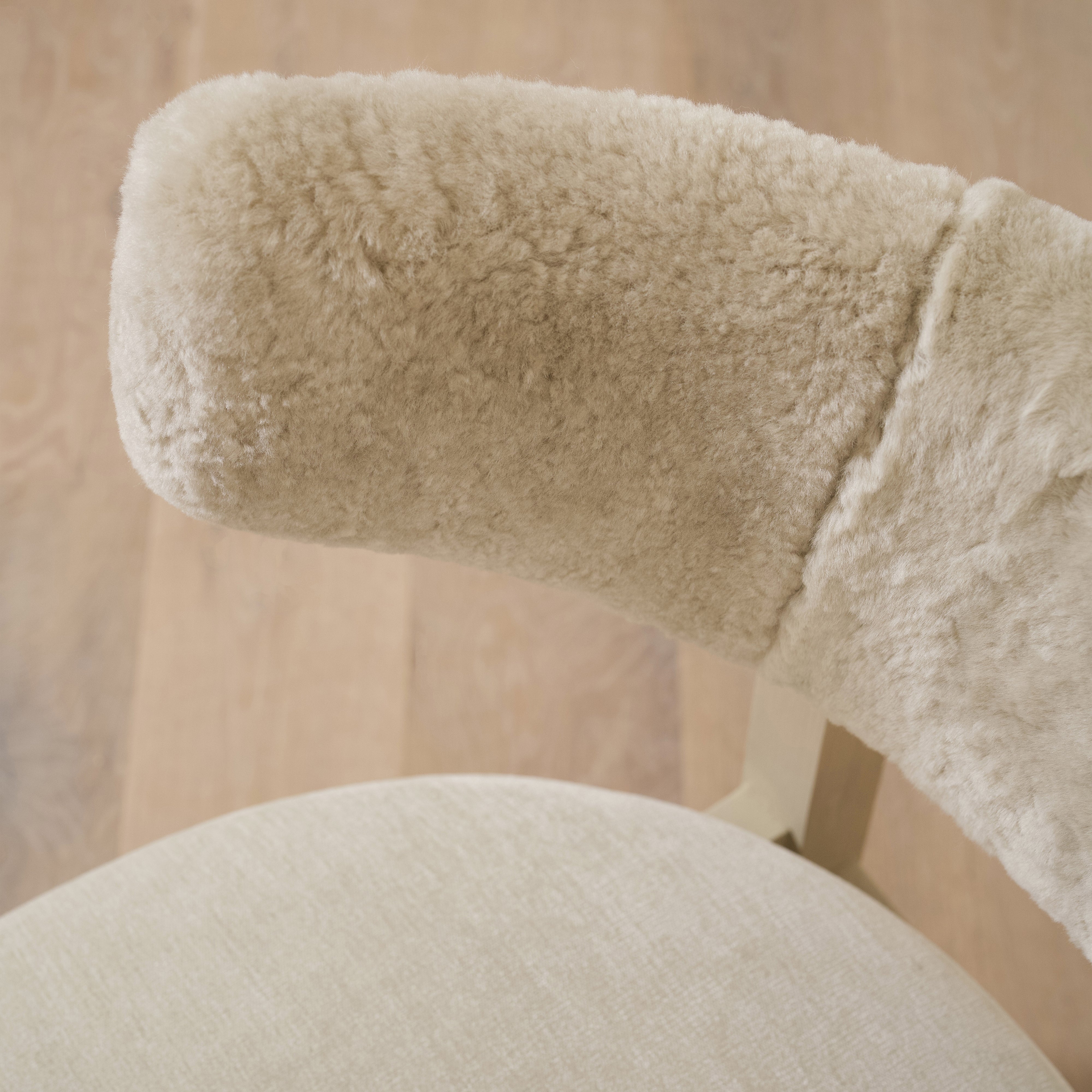 Variant 3- Dusty Beige Shearling back, Canyon Dune seat. Sand oak.