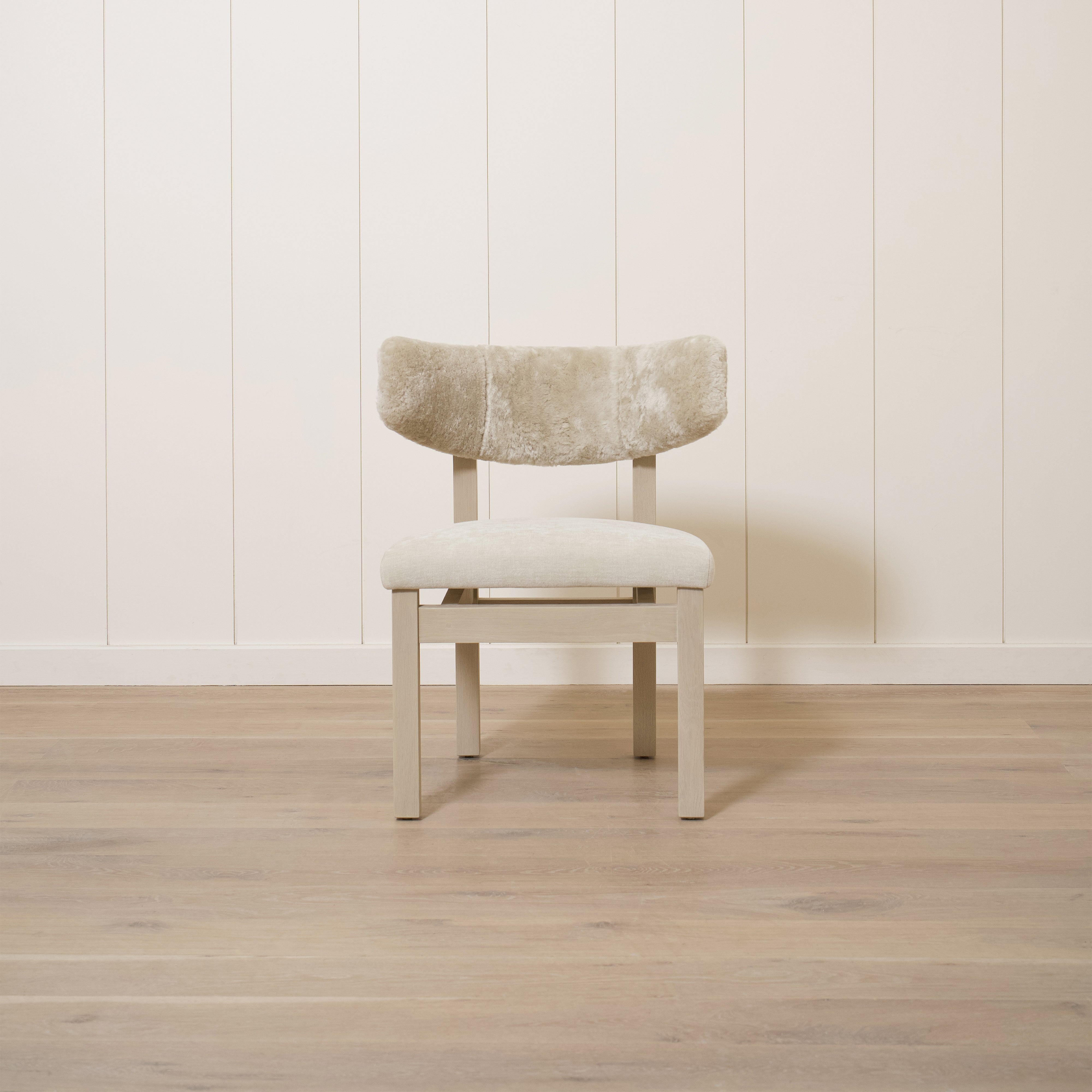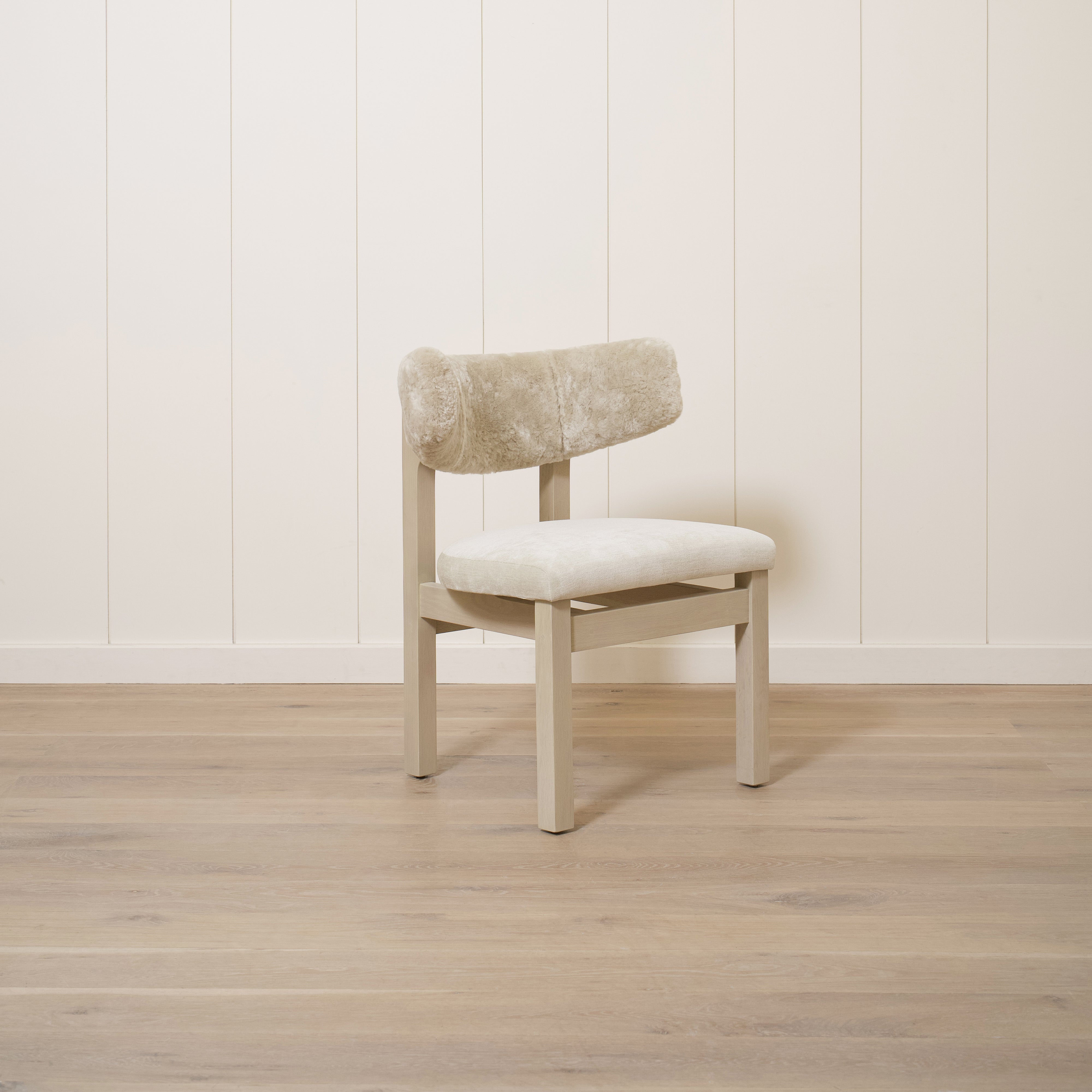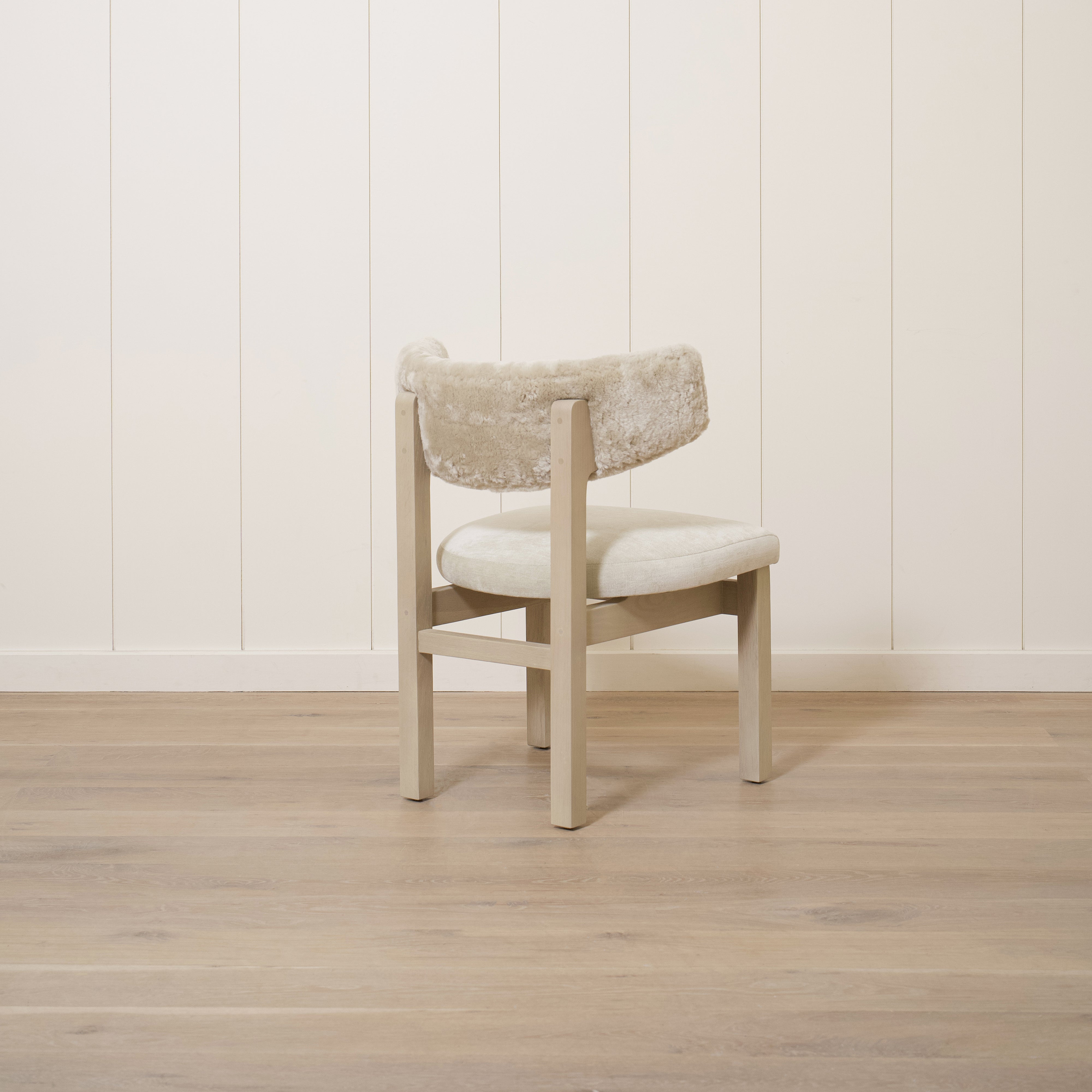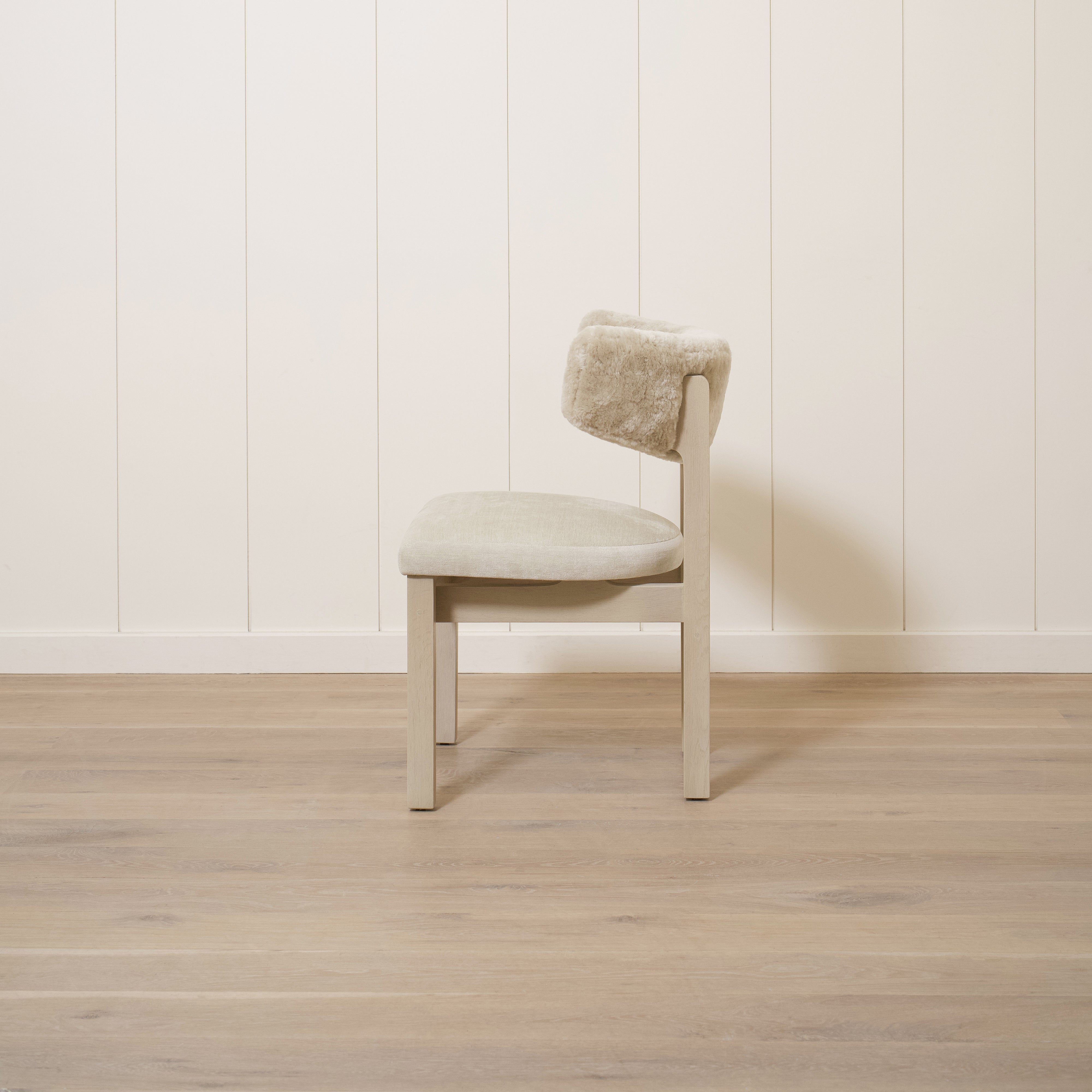 Variant 2 - Sheepskin White back, Sky Flax seat. Sand oak.