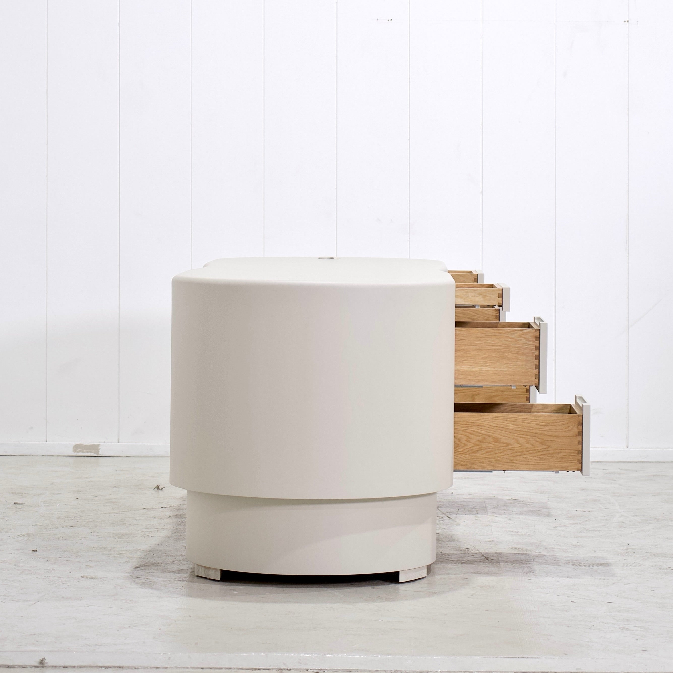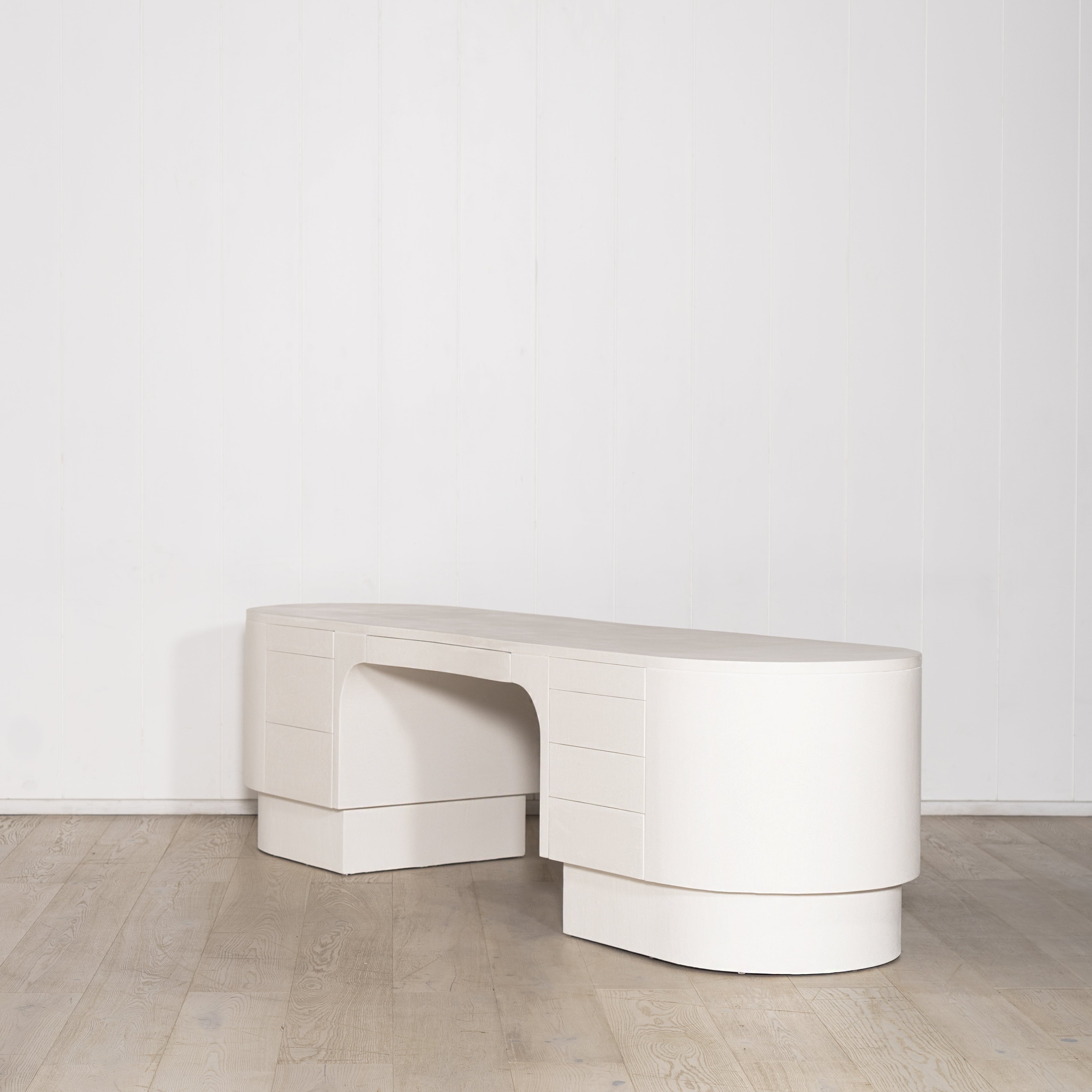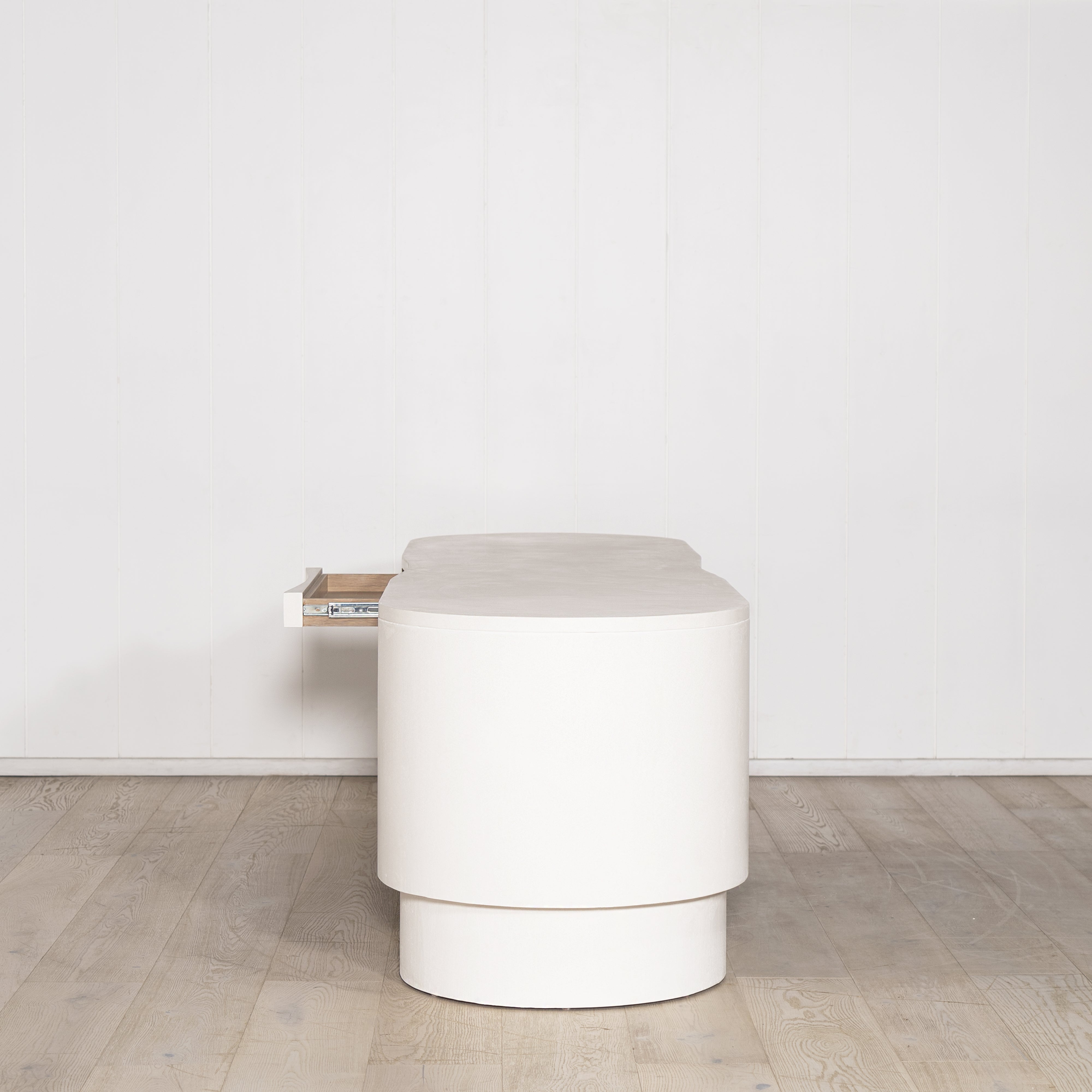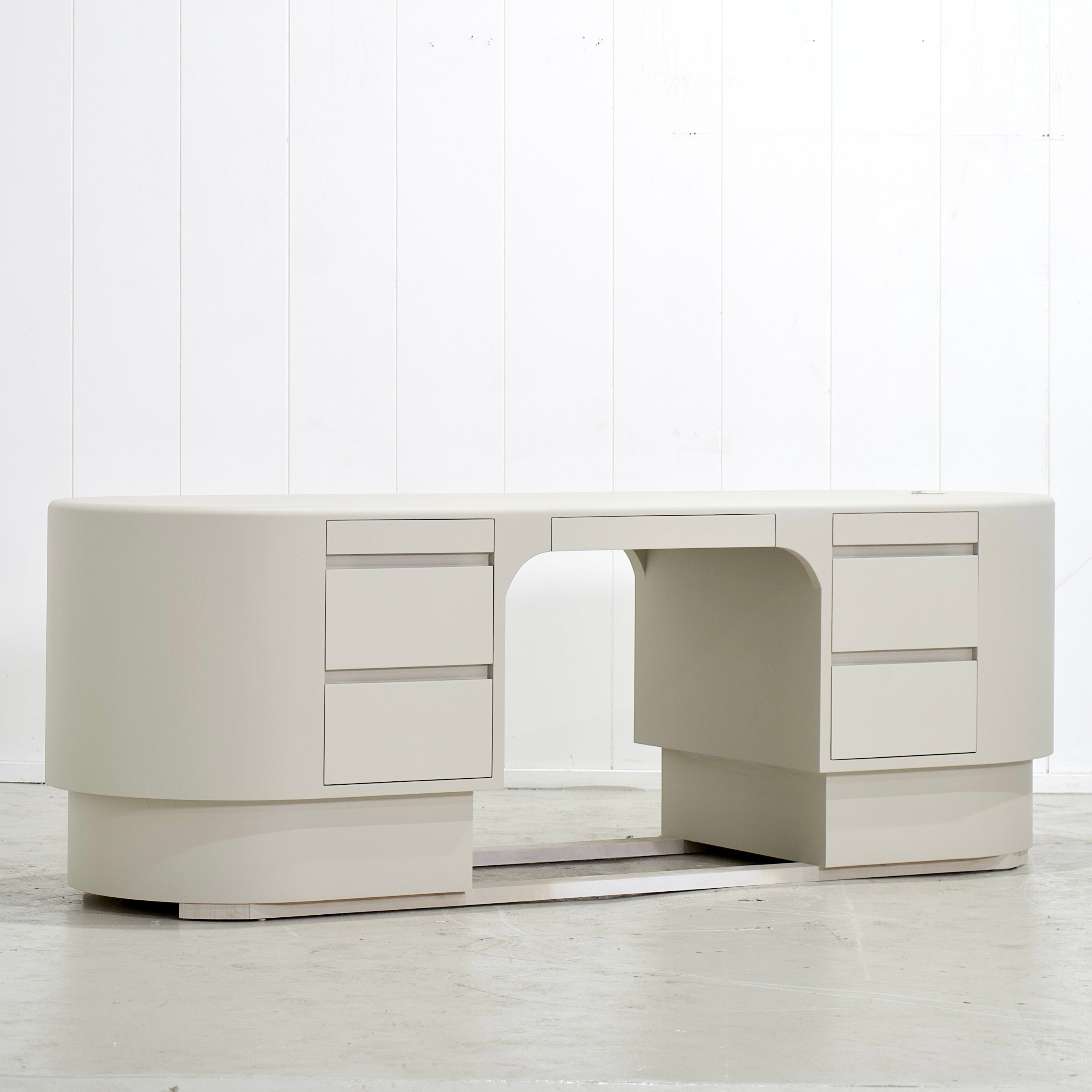 Variant 1 - S - 90"W x 30"D x 30"H, Custom Limestone Finish Painted White, Integrated Finger Pull and Grommet